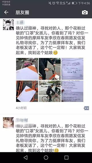 日思夜想之后,这个叫李欣的摩拜小哥终于脑瓜开窍,想到通过摩拜单车大撒“情书”的方式,希望通过大范围曝光,这个戴口罩的鼻炎过敏女孩儿能够看见他。